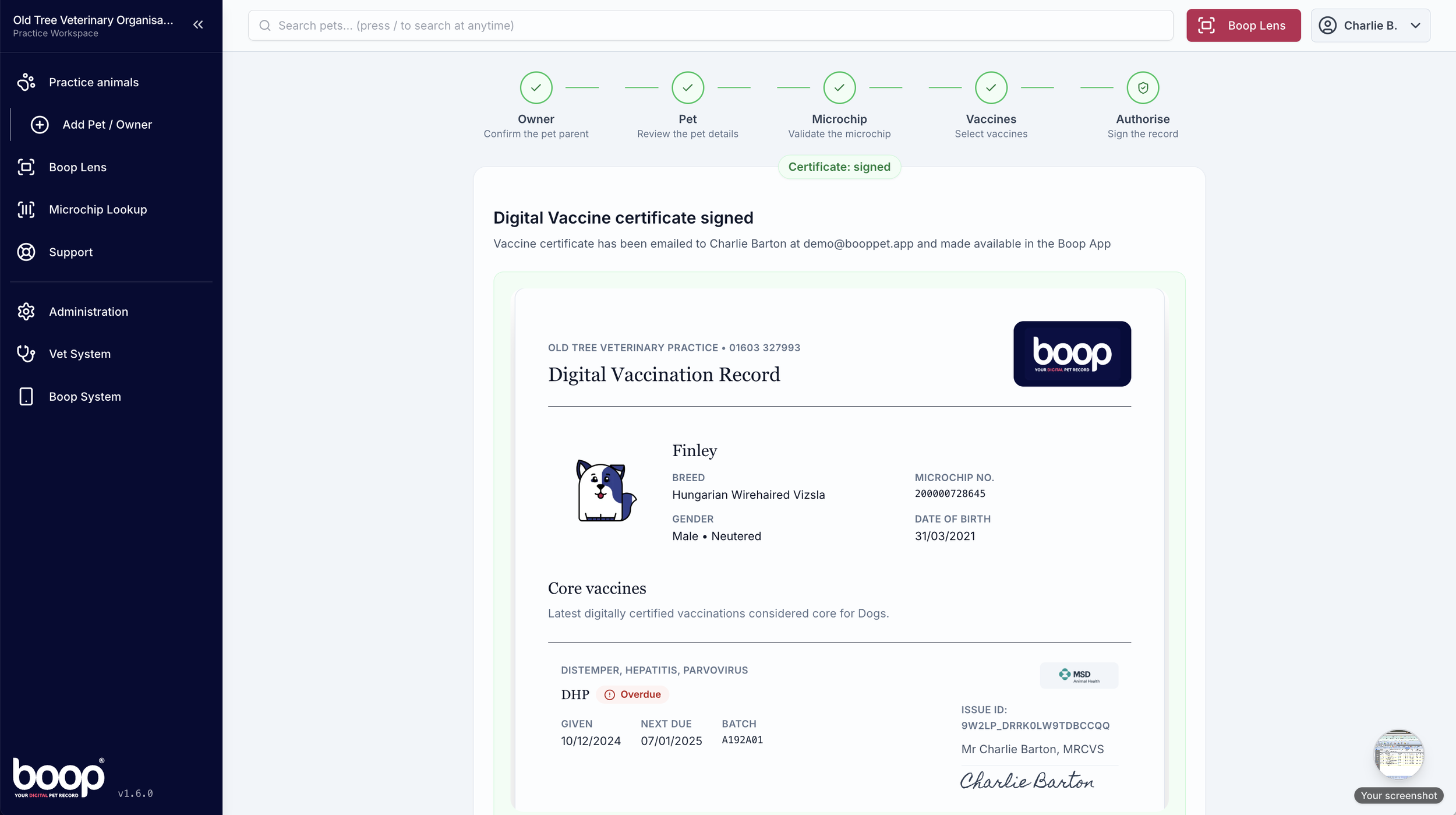 Vets use the web portal at https://vet.booppet.app to esign your clients vaccination records and more.